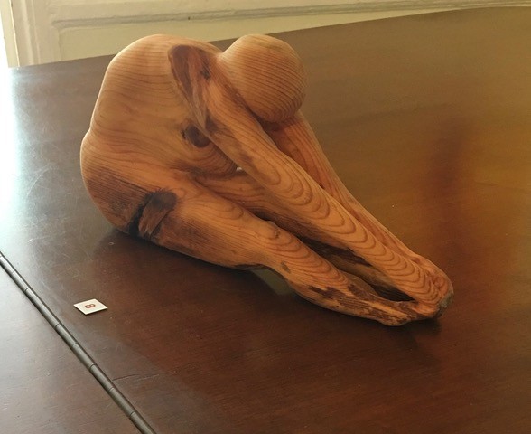 The title of the exhibition is ‘Profundo’ (‘Profound’). There are 19 works by Gwen in total, all having titles in Papiamentu. Number 1, ‘E sabionan’ (‘The wise ones’) is a sculpture of 2 figures attached to each other’s backs, but each facing a different direction. ‘Deboshon’ (‘Devotion’) is an endearing sculpture of a figure sitting bent over on the floor, with its fingers stretched out to reach its toes. ‘Tambú’ (‘Drum’), is a work dug out of a tree trunk, showing a part of two figures: the trunk and the upper thigh. The two figures are attached at the hip. The wood is partly crude and partly treated. Additionally, it was accentuated by painting part of the work with a light hand of red paint. The sculpture emits a profound and primitive strength. It holds the promise of all Gwen is capable of as an artist if indeed he continues down this road and dedicates himself to developing his talent.