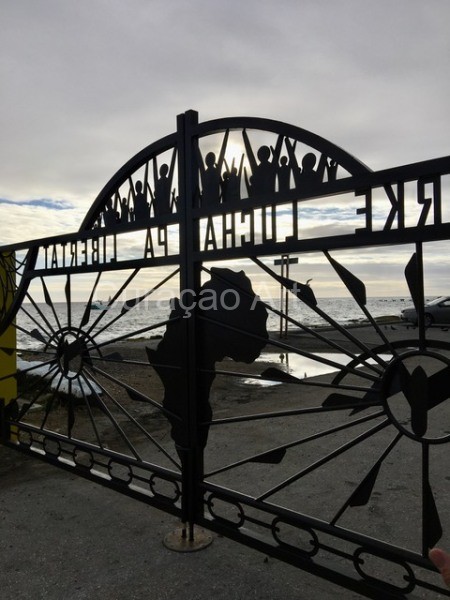 The gate fits between two wide yellow pillars. The two halves of the gate are symmetrical in design and construction. At the bottom, a chain is placed, referring to the chains of slavery. Giovanni consciously interrupted the two ends of the chains with the pillars. A pole is attached to the side of one of the pillars, aiming upwards. The second pillar has nothing attached to it and symbolizes freedom.