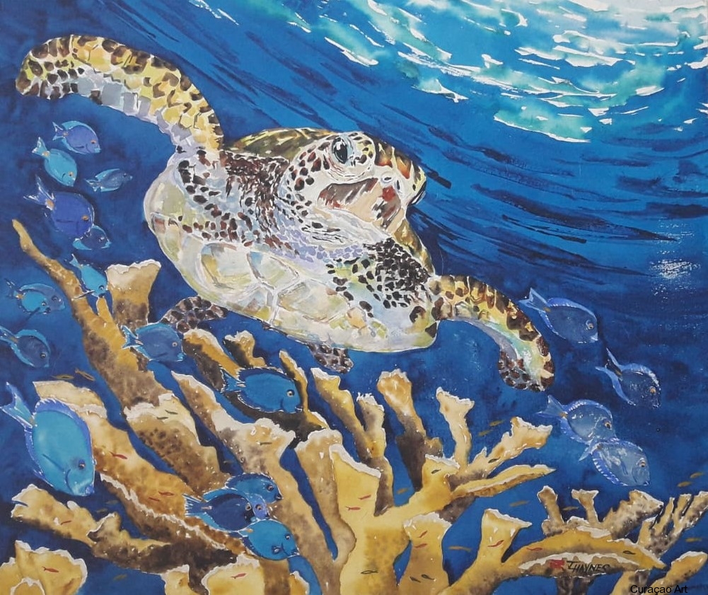 Before moving to Curaçao, Tanya had ‘working-vacations’, filled with lots and lots of diving. She would take pictures and make sketches to work out back home. Her diving adventures took her all over the Caribbean and South Pacific. The biggest impact on her paintings came from diving at the Fiji reefs. These were incredibly colorful and teaming with aquatic life. While Fiji and Australia where high on her list of locations to move to, Tanya chose to make Curaçao her permanent home 2010. Here she found an adequate market for her art and lots of diving locations to choose from.
