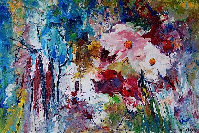 After four years, Bert Nienhuis left the academy with the intention of making a living from his art. But at the end of the Sixties and the beginning of the Seventies, it proves hard to provide for his family as an artist. He, therefore, decides to join his father in the family business Nienhuis Montessori. After an impressive 30-year career, he steps back and moves to France. He settles in a small mountain village and again starts to paint. Bert mainly paints landscapes, and the delicate colors of his surroundings in France inspired him to create numerous land- and cityscapes. In 2009 he relocates to Curaçao, and the first year is spent exploring the island and the new scenery with its bright colors. The island challenges his palette, his technique, and his imagination. After some adjustment, he starts creating oil paintings and watercolors in his impressionist style, now in bright, explosive colors.